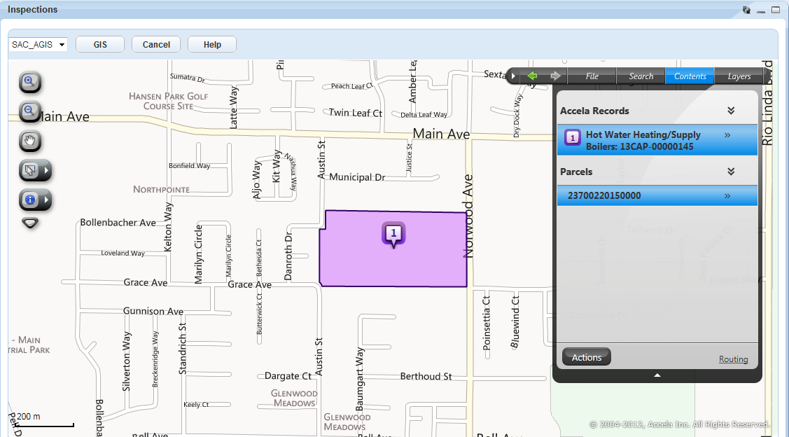 You must associate districts with both inspections and inspectors to automatically schedule inspections. You can manually assign the districts to inspections. You can also assign districts by selecting areas in Accela GIS. See your agency administrator for information on how to associate districts with inspections using Accela GIS and on how to set up an inspector profile.