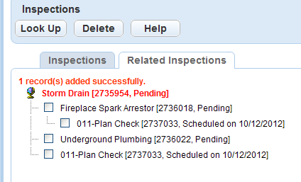 Civic Platform automatically adds the new inspections to the list of pending inspections at the bottom of the page and auto-checks the new inspections for scheduling.