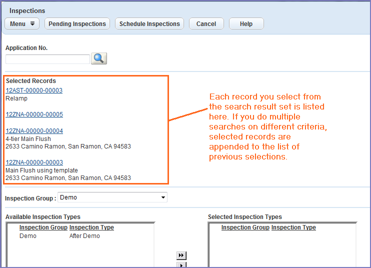 Civic Platform lists the selected records, along with inspection setup fields. If you perform more than one search on different criteria and select application records from multiple search result sets, your selections append to the list of previous selections. This multiple search process enables you to schedule several inspections for different applications at the same time.