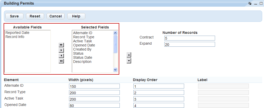 Contract The number of items to display on a page when you contract the list. Display Order Where the field displays in the field order (from left to right). Element A list of fields in the Selected Fields box in their current order. Expand The number of items to display on a page you expand. Label Label for a field. Agencies can customize this value as needed. Width (pixels) The column width in pixels. Click Submit.