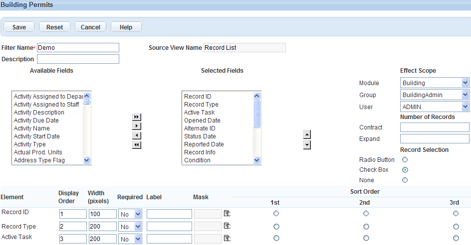 Table 1. Edit View Field Descriptions A > Z Ascending Use to sort field data alphabetically from A to Z. Contract The number of items to display on a page when you contract the list. Description The description for the filter you are creating. Effect Scope The availability of the customized sort/filter using the drop‑down feature for Module, Group, and User. Element Civic Platform lists the fields in the Selected Fields box in their current order. Expand The number of items to display on a page when you expand the list. Filter Name A descriptive name for the filter. Label A customized label for the field. Mask A mask to limit the type of data a field accepts. A mask might include symbols for currency, phone number, SSN, or zip code. Record Selection The type of record selection tool you want to choose for the list. Choices include Radio Button or Check Box. Sort Order Indicates the sort priority of an item. Defining sort order is useful for organizing as well as grouping list items. Source View Name The name of the form that you are modifying. Width (pixels) The number of pixels for the column width. Z > A Descending Use to sort field values alphabetically from Z to A.