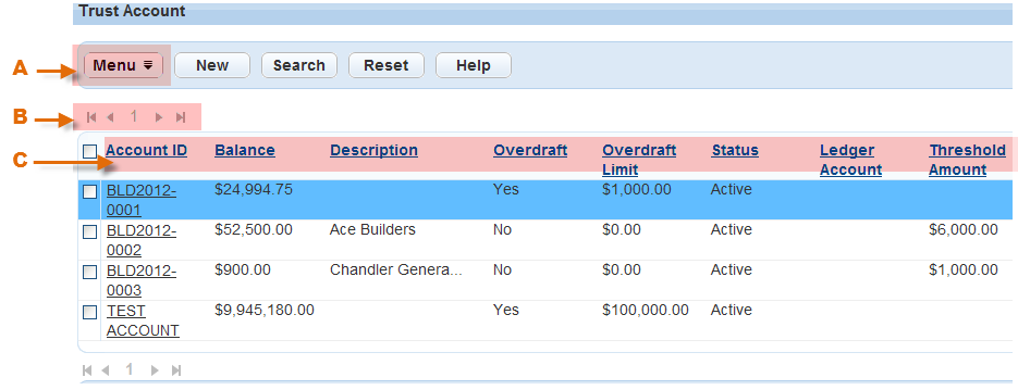 | A | Use the Menu button to access a menu of general tasks related to the records in the selected portlet. |