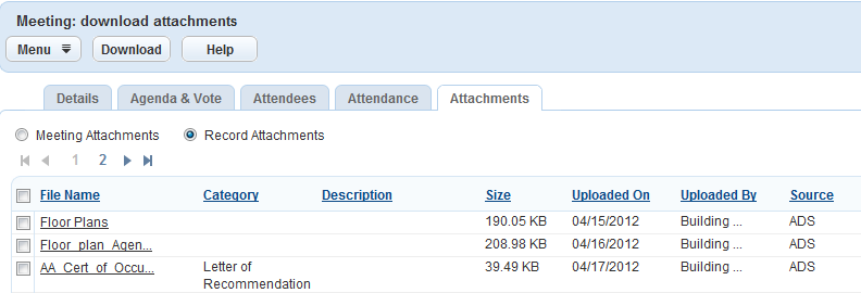 Civic Platform displays attachments to the records that comprise the agenda of the meeting (Working with Meeting Agendas and Voting).
