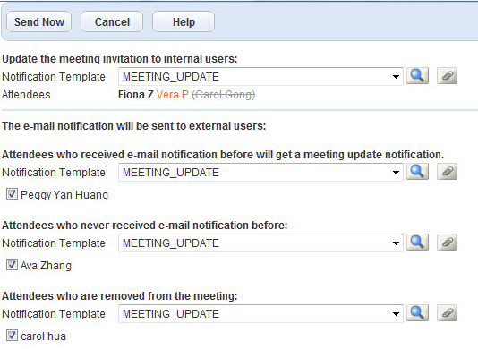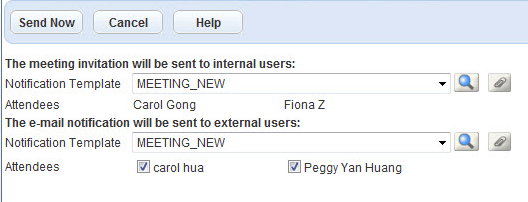 Note:The email notification form lists attendees who received a prior email notification.