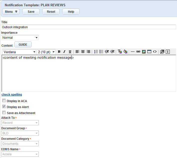 If your agency implements Microsoft Outlook integration, Civic Platform also displays meeting notification information for Microsoft Outlook.