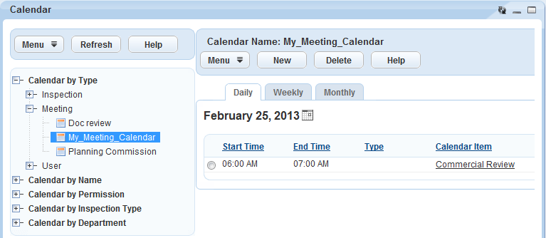 Note:You can navigate meeting calendars by type, name, permission, inspection type, or department.
