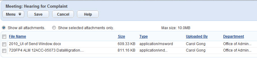 Note:The file size for all selected attachments must not exceed the maximum size. To change the maximum size, see Communication Manager > General Settings > Attachments settings > Field “Maximum Size of Total Files.”