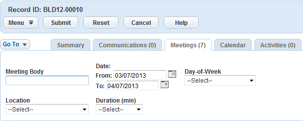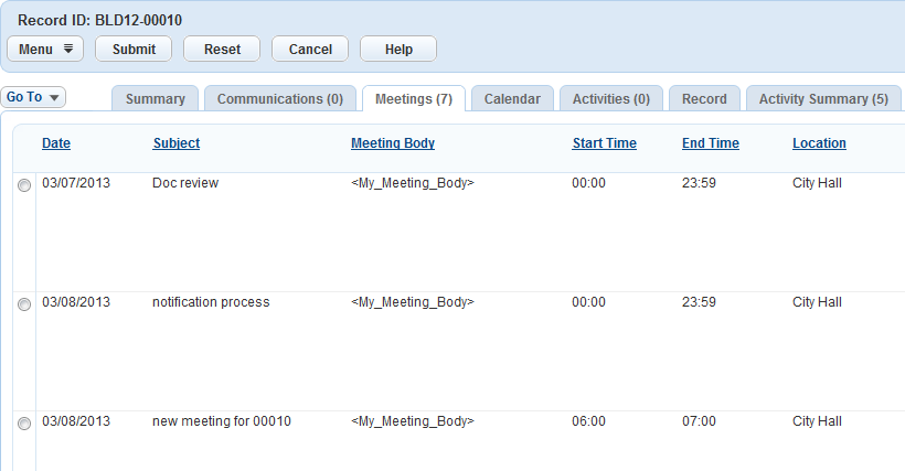 Click the Meetings tab in the record details portlet.