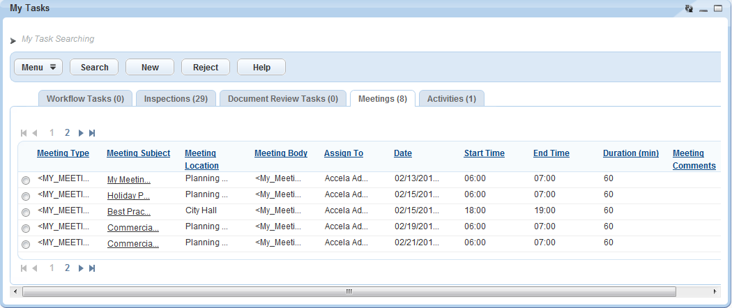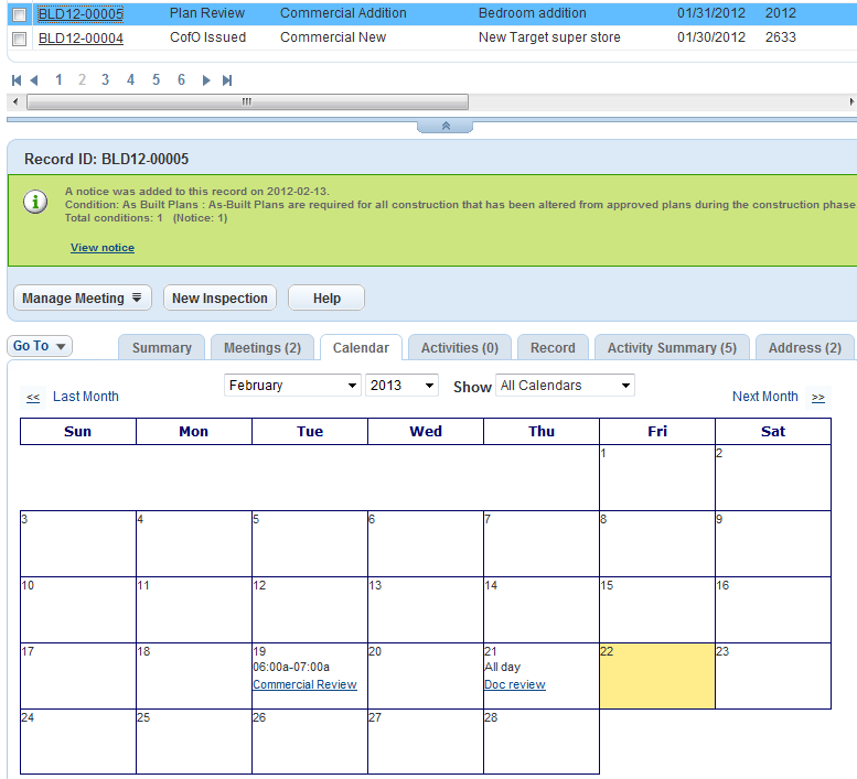 You can navigate to inspections, meetings, and user events from the Calendars portlet. You can also find scheduled meetings from the Records portlet and the My Tasks portlet.