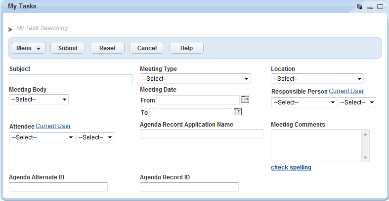 Table 1. Meeting Search Criteria Label Description Subject Field containing the meeting subject Meeting Type Drop-down list containing the available meeting type values. You determine value options by the MEETING_TYPE Standard Choice. Location Drop-down list containing the meeting location values. You determine value options by the MEETING LOCATION Standard Choice. Responsible Person First drop-down list is department, second drop-down list is name Meeting Date, From\To Search by a range of meeting dates. Meeting Body Drop-down list containing meeting body values. You determine value options by the MEETING BODY Standard Choice. Meeting Comments Text area Attendee If meeting includes the specified attendee, you can search the meeting by the attendee. Agenda Record ID Search meeting by meeting associated record ID. Agenda Alternate ID Search meeting by meeting an alternate record ID. Agenda Record Application Name Search meeting by meeting associated record application name.
