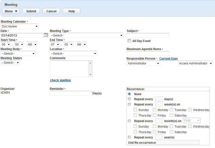 Note:The fields to complete depends on the calendar type (meeting, agency holiday, user) for which you are scheduling an item.
