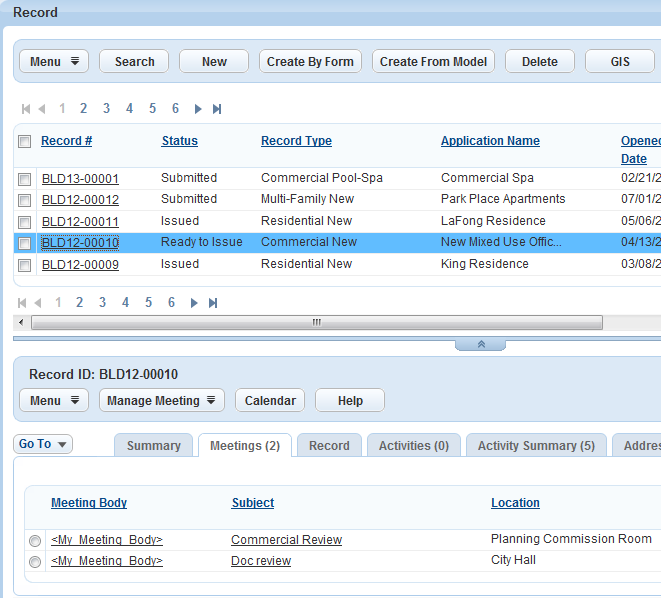 You create, review and modify meeting agendas and other meeting details in the Civic Platform Calendar portlet. When you schedule a meeting, you use a meeting calendar and meeting type.