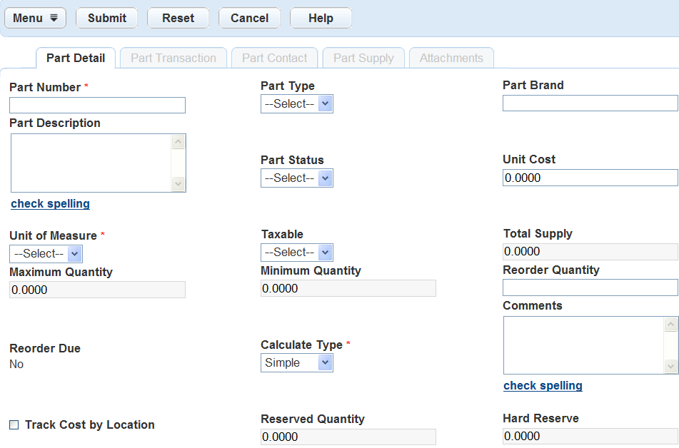 Some part supply details such as the minimum quantity, maximum quantity, reorder quantity, and unit cost, auto-calculate based on the quantities of a part at a stock location.