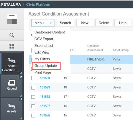 You can edit or update multiple Asset Condition Assessments at the same time if they all require the same change with the Group Update feature. For example, you can add the same Schedule Status to all the records using the Group Update function.