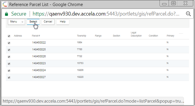 If selecting multiple GIS parcels that have multiple reference parcels, select the parcels to be added to the set from the Reference Parcel List, and click Select: