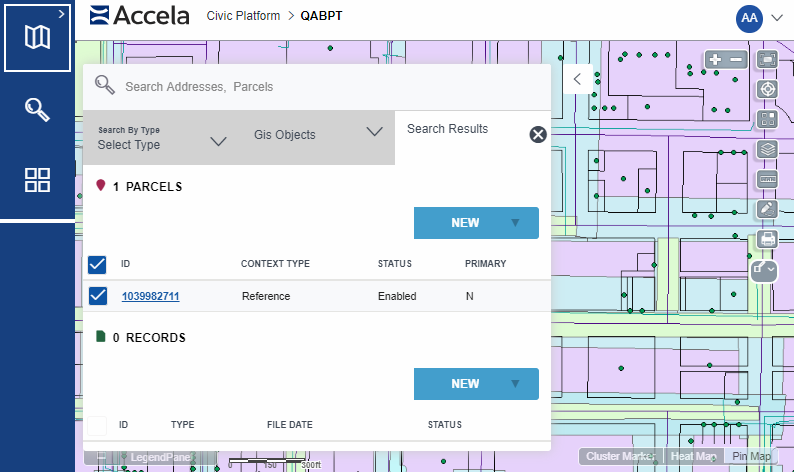 - Search Results tab - Lists the parcels, assets, and transactional records that are associated with the selected GIS objects on the map. This tab is refreshed when you select or deselect items on the GIS Objects tab or when you select more objects on the map.