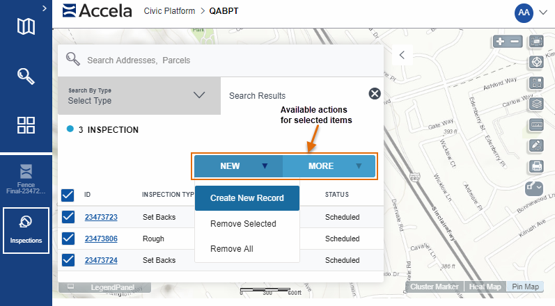 - Search By Type tab - Used to locate Accela objects (inspections and records) and GIS Features.