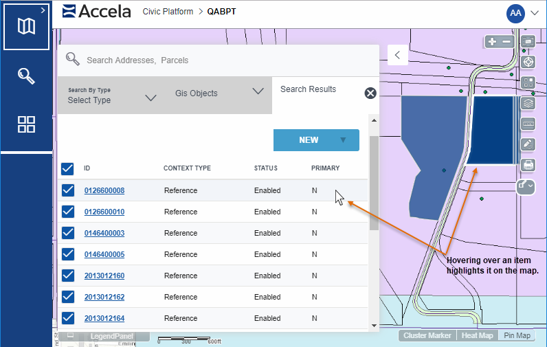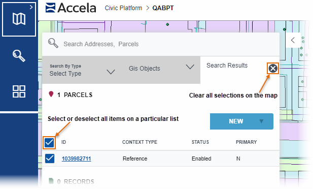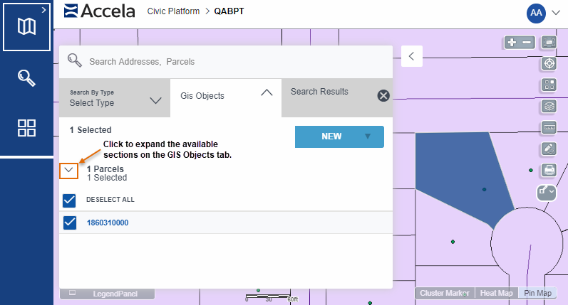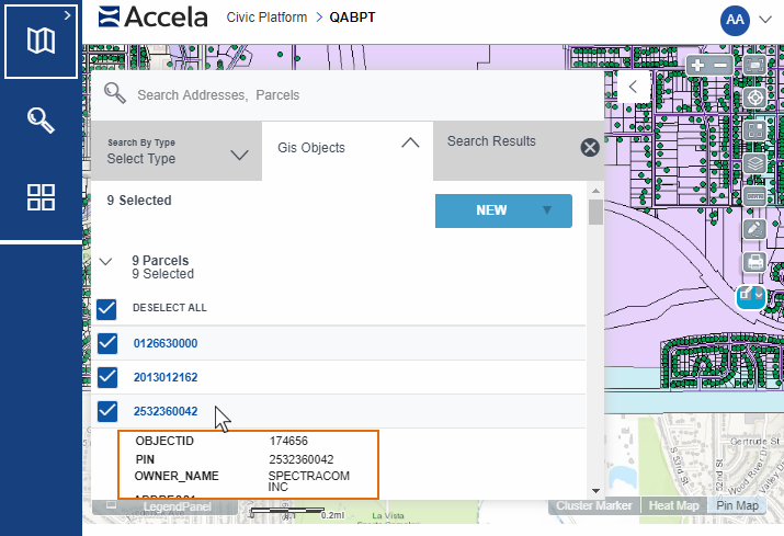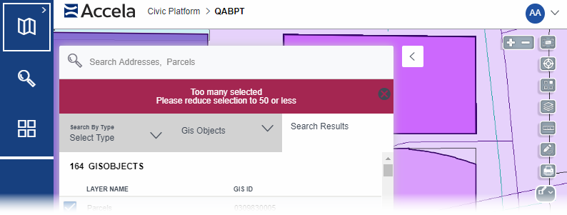 Accela GIS provides various ways to select GIS objects or features on the map. When you select multiple GIS objects on the map, the Contents panel slides down on the left, and lists the related parcels, assets, and GIS objects on the available tabs.