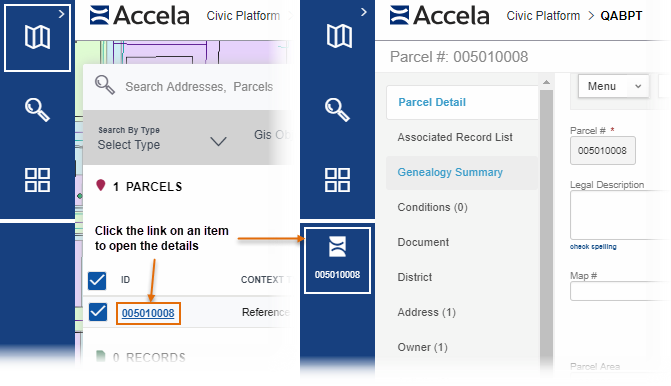 - Click an item link to open the details about the parcel, asset, or transactional record: