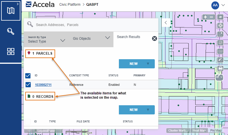 - GIS Objects tab - Lists the GIS objects or features that are selected on the map. The GIS objects are listed by the map layer they belong to (such as Parcels, Records, and others). As items are selected or deselected from the map, the lists of related parcels, assets, and records refresh on the Search Results tab.