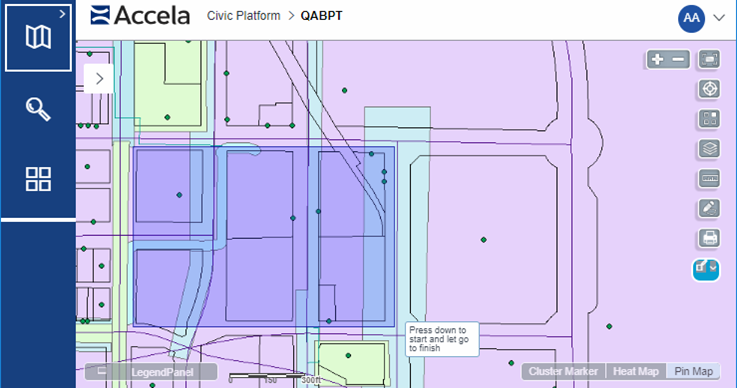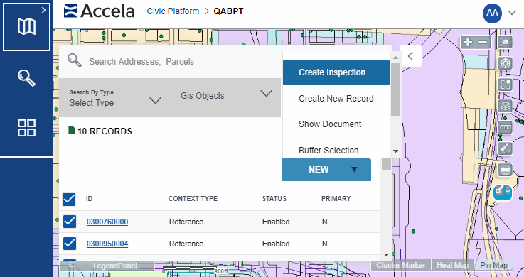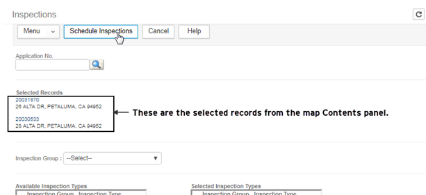 From the map dashboard, inspectors can select parcels or addresses on the map, select records, and schedule inspections. Accela GIS also allows multiple inspections to be created on multiple records in the same transaction.