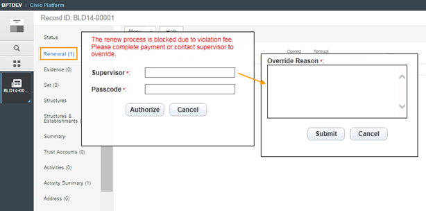 Supervisors can override Civic Platform's license renewal process that prevents citizens from renewing licenses when they have outstanding fees. For example, a citizen might have outstanding fees when they come to the agency for a license renewal. In this case, the citizen cannot renew the license because of the fee violation. However, if they pay the fees and submit proof of payment to the cashier, a supervisor can authorize the renewal of the license in real-time.