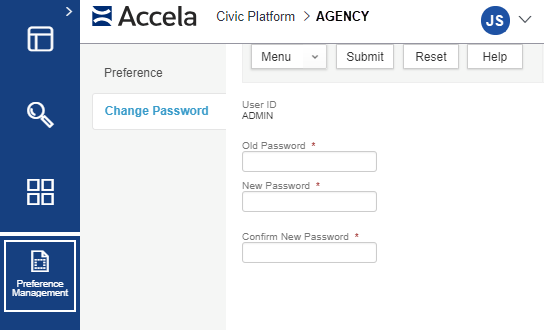 - Enter your old password, then the new password. If you want to know your agency's password requirements, contact your administrator.