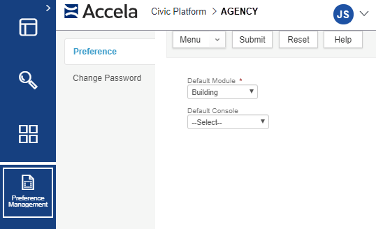 If you have access to multiple modules (such as Licensing and Enforcement) and/or multiple consoles, you can define your default workspace (and switch modules/consoles) on the Preference Management page. The selected default module and console selections display each time you log in.