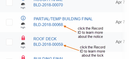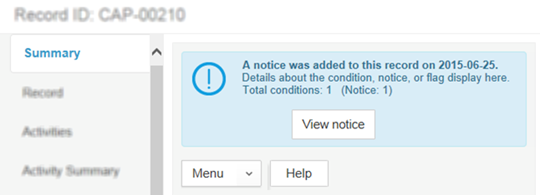 When you see one of these icons, you can click the Record ID open the record and learn more about the reason it is in place. The notice displays at the top of the page.