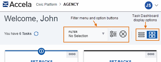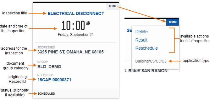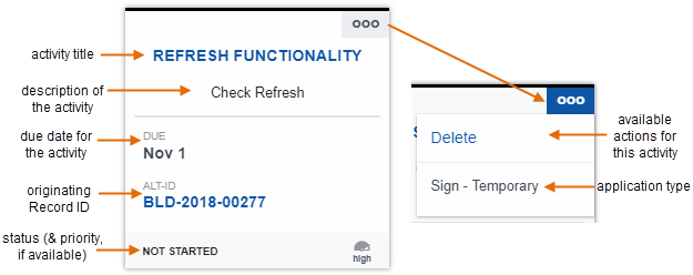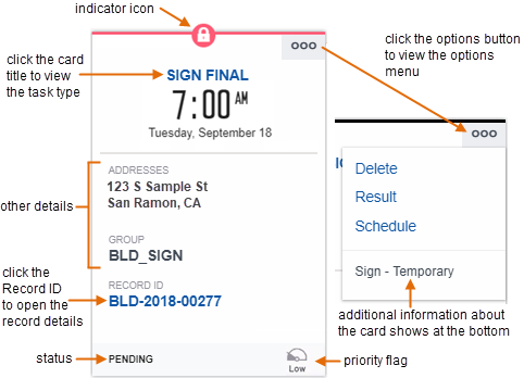 Options button - Every task card has a slide-out panel that provides you with a list of actions you can perform on the task. Slide-out panels may also provide hyperlink access relevant records, such as a permit record or a primary contact. The actions you can perform varies by task type.