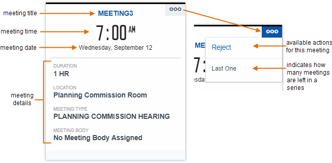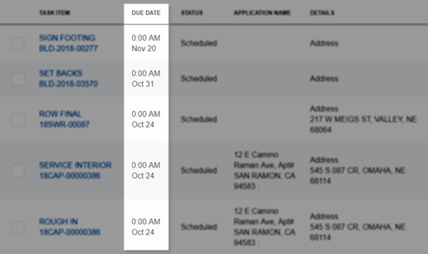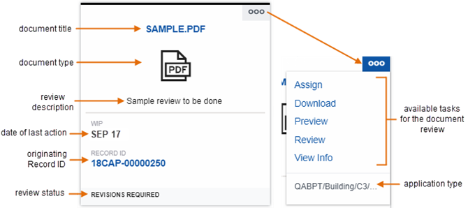 - Other Details - Task-centric details can tell you something about how you should interact with that task. Different task types offer different details, such as the due date, addresses necessary for the inspection, the group assigned to the task, etc. For example, if the record includes an application name (also known as project name), an application name assigned to the record shows on the card. Or you can preview documents for document review tasks.