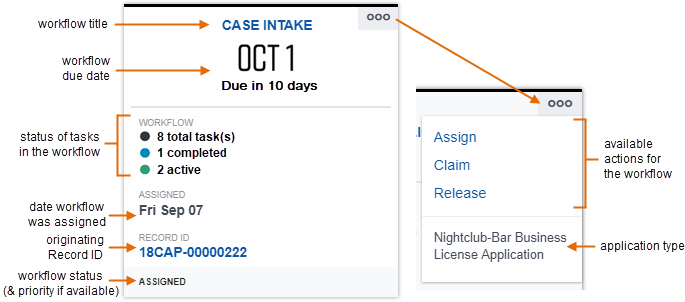 - Other Details - Task-centric details can tell you something about how you should interact with that task. Different task types offer different details. For example, if the record includes an application name (also known as project name), an application name assigned to the record shows on the card. Or you can preview documents for document review tasks.