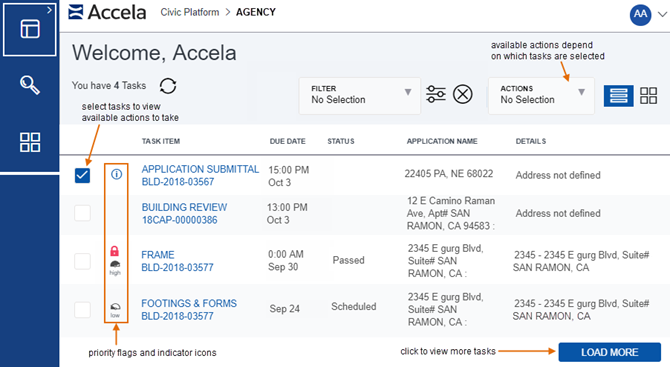 - View Tasks - Task items are listed in a table format. Six tasks display by default when the page first loads. Use the Load More link to view more of your tasks.
