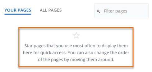 This area defaults to the Your Pages view, which contains a list of the pages bookmarked as favorite pages for the user. This view only shows the tooltip until pages are starred on the All Pages tab.