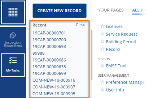 You can click any record in the list to launch it in a new space. If the recently visited list gets too long, you can clear the list. Be aware that, when you clear the list, the action is permanent.