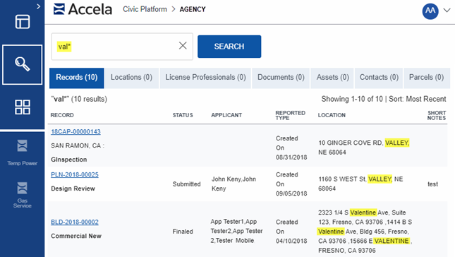 Global Search allows you to find records quickly by entering a simple search criteria on the search box. The global search results list includes the Record (ID and record type), Status, Applicant, Reported Type, Location, and Short Notes columns. This version of Civic Platform includes search functionality upgrades that make finding things inside Civic Platform a more intuitive process. The new search features are built on the Elasticsearch (or Elastic Search) engine with wildcard and string search operators, providing more intuitive and robust full-text searches.
