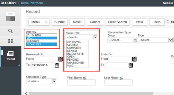 Note: Cross-agency searches are only supported for record and inspection searches. However when FID 8403-Multi Agency Switch is enabled, cross-agency search fields (Agency and Status Type) may display in search forms where cross agency searches are not supported, and will only return results from a single agency (the agency you are currently logged in to).