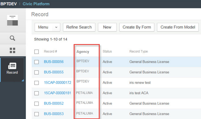 The records search page now includes an Agency column, so that you can sort records by agency. The Agency column only displays in multi-agency environments (FID 8403-Multi Agency Switch is enabled).
