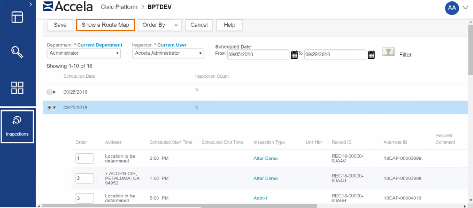 A route sheet helps inspectors organize inspections and displays inspection routes on the map, enabling inspectors to minimize the time and distance that they travel. Inspectors can view their scheduled inspections, order them according to their preference, add a stop to their route, and then view their route on the map.