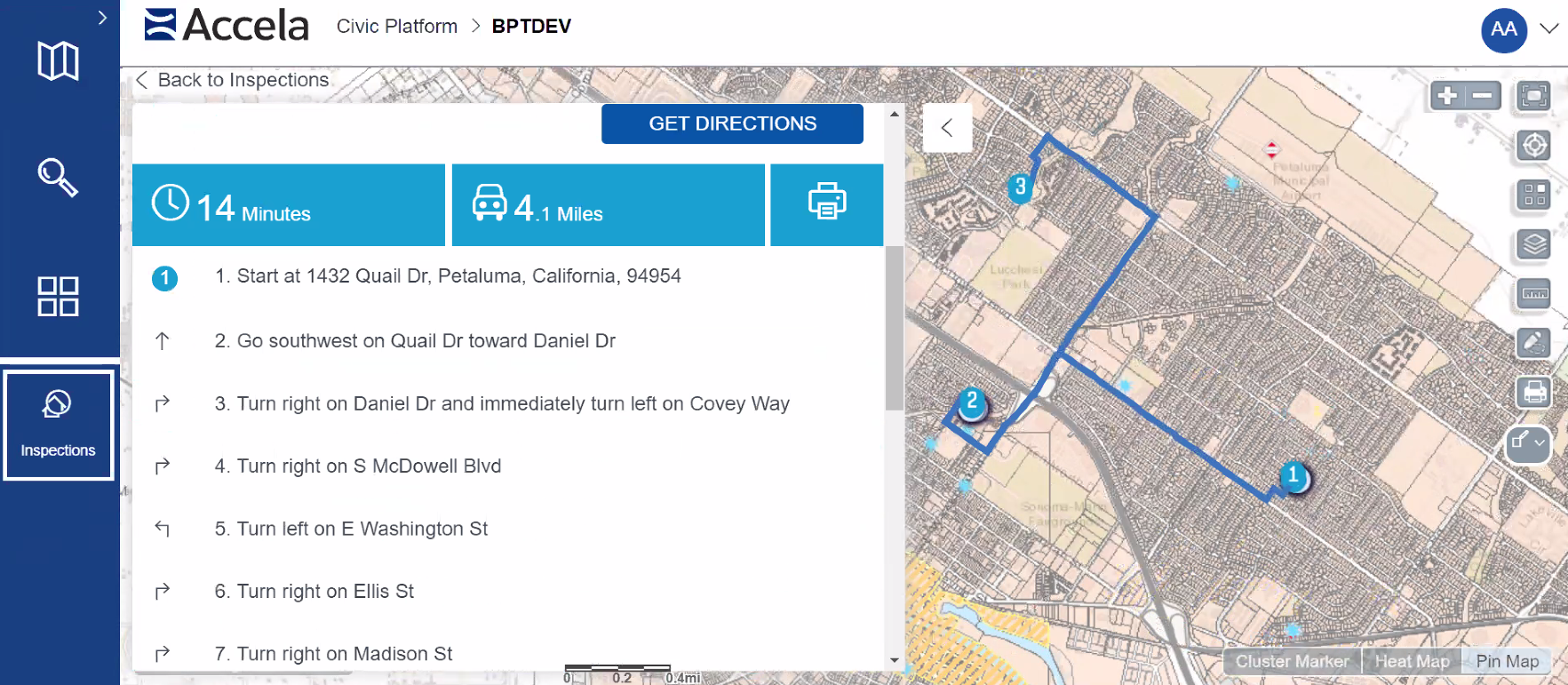 When satisfied with the changes and ready to view the inspection route, click Get Directions. Any changes made before clicking Get Directions are then updated in the database. Scroll down to view turn-by-turn directions.