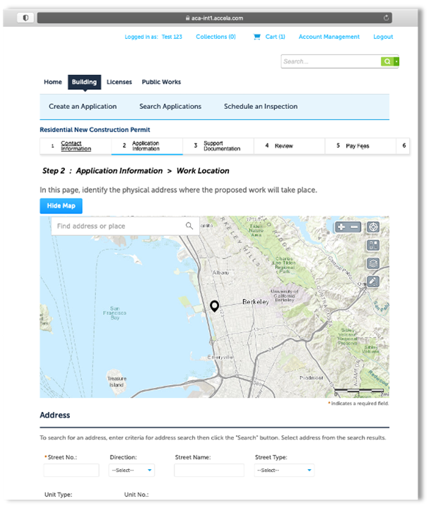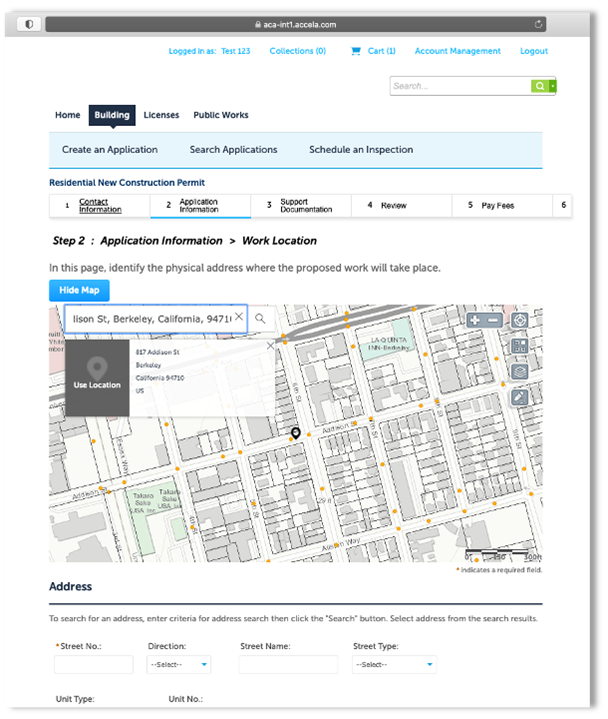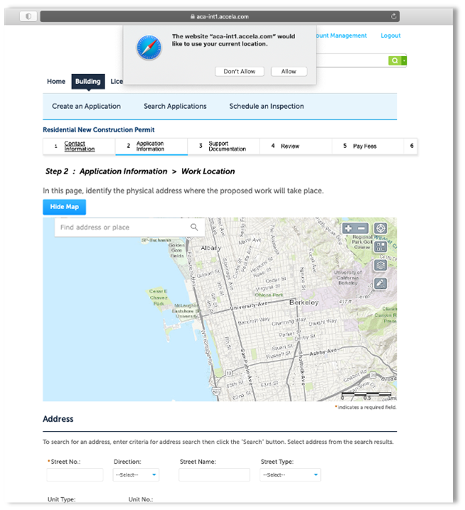 Citizen Access now allows geolocation with the citizen’s consent. This allows the citizen to pin their location on a map when applying for a permit or reporting an incident. If the citizen does not consent to the ‘use location’, the pin will be placed on the map using the default setting of the Accela AGIS basemap settings.