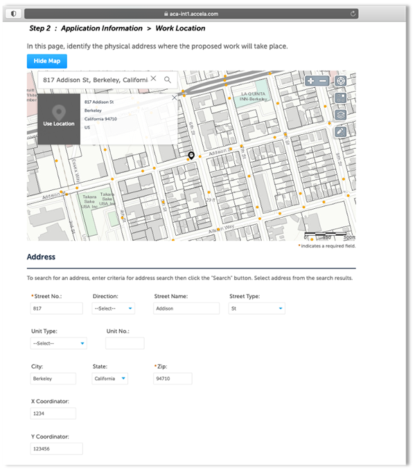 This feature captures the location’s XY coordinates. If the agency has X Coordinate and Y Coordinate fields in the Addresses page in Civic Platform, those values are included along with the other address information when the record is submitted.